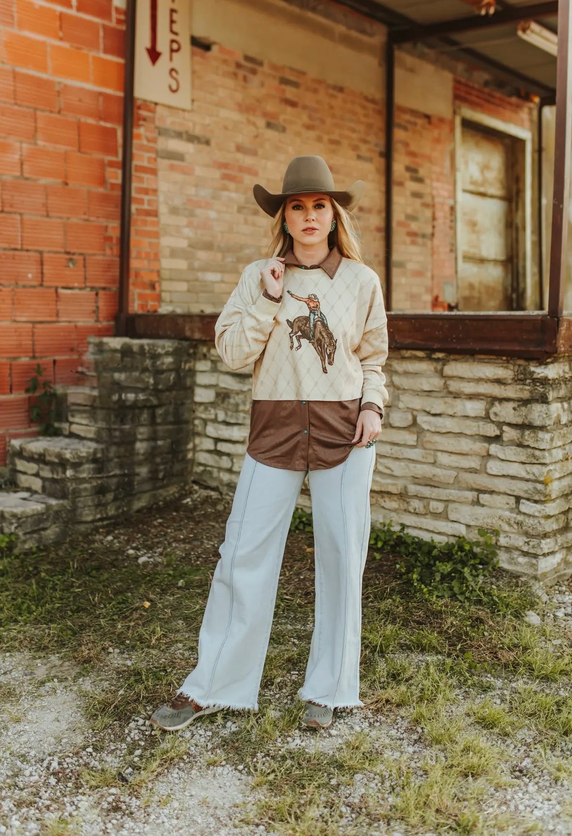 This long-sleeve rodeo bucking top exudes the energetic and passionate spirit of the rodeo. With its bold design and durable construction, it's the perfect choice for any rodeo enthusiast. Get ready to ride with confidence and style in this one-of-a-kind top!